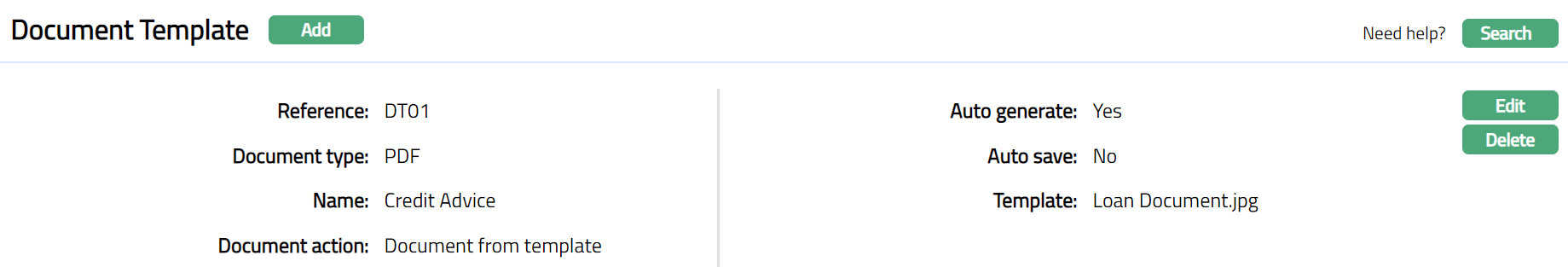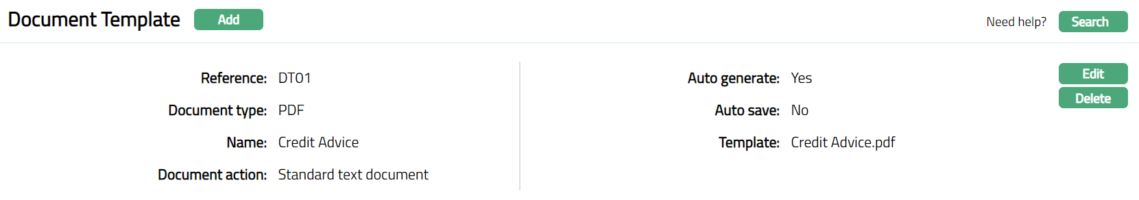 Delete: You can delete a Document Template saved in Aura by a click on Delete button. Aura will ask for confirmation; and on confirming, the selected record will be deleted.