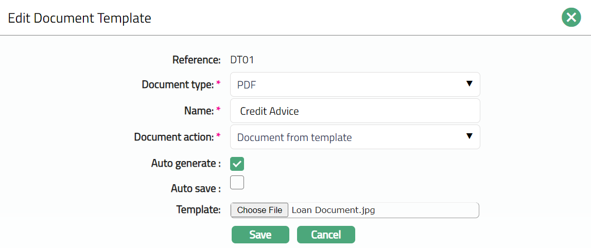 Select Auto Save checkbox if you wish to allow the Document to be saved automatically by the system when the document gets generated. This checkbox is enabled only when Document from template is selected.