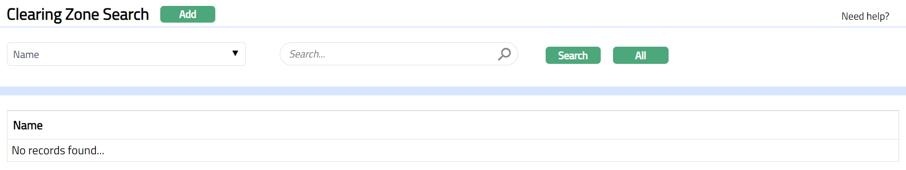 - From Admin menu, click System codes, then Generic definitions, and then Clearing Zone. Clearing ZoneSearch page appears.