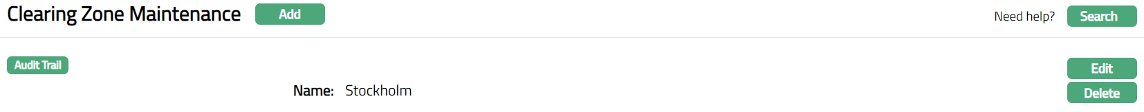 - Click Save. Clearing Zone Maintenance page appears with the edited details.
