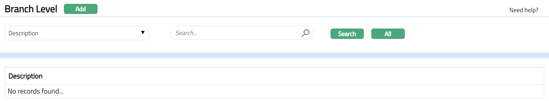 - From Admin menu, click System Codes, Generic Definitions, and then Branch Levels. Branch Level Search page appears. All Branch Levels available in Aura appear on the page, sorted alphabetically based on description.