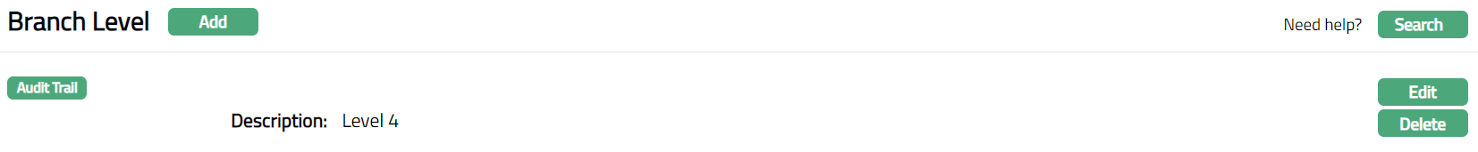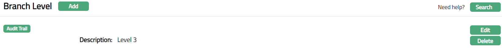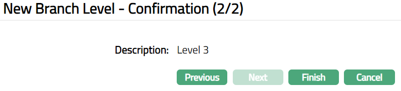 - Click Finish. Branch Level page appears displaying the details of the Branch Level you added.
