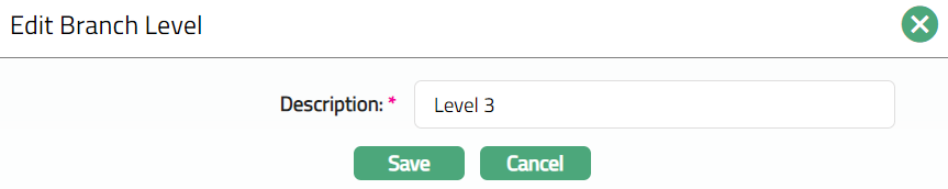 Delete: You can delete a Branch Level saved in Aura by clicking Delete button. Aura will ask for confirmation, on approving which the selected record will be deleted. If the record is already in use, then you cannot delete the same.