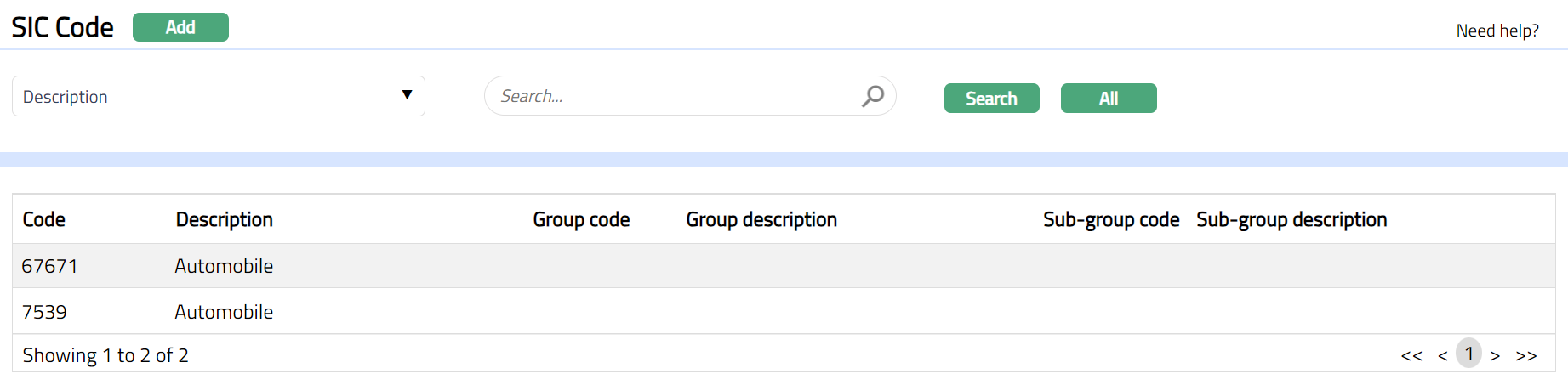 - From Admin menu, click System Codes, Generic Definitions, and then SIC codes. The SIC Code Search page appears. All SIC codes available in Aura appear on the page, sorted alphabetically based on Code.