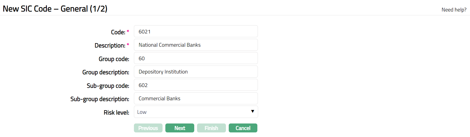 - Click Finish. SIC Code page appears displaying the details of the SIC Code you added.