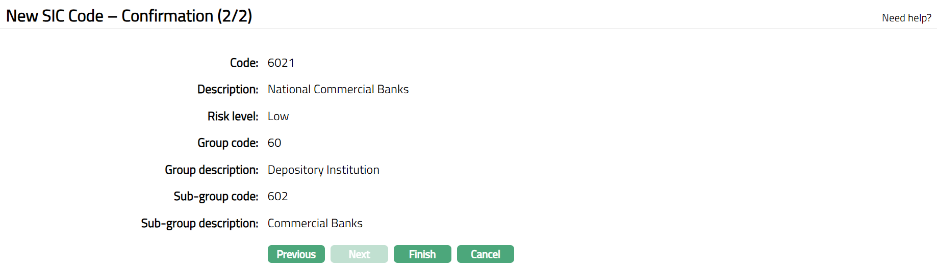 Click Next. New SIC Code -- Confirmation (2/2) page appears.