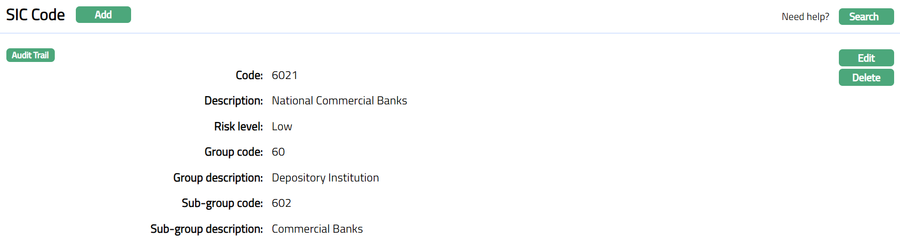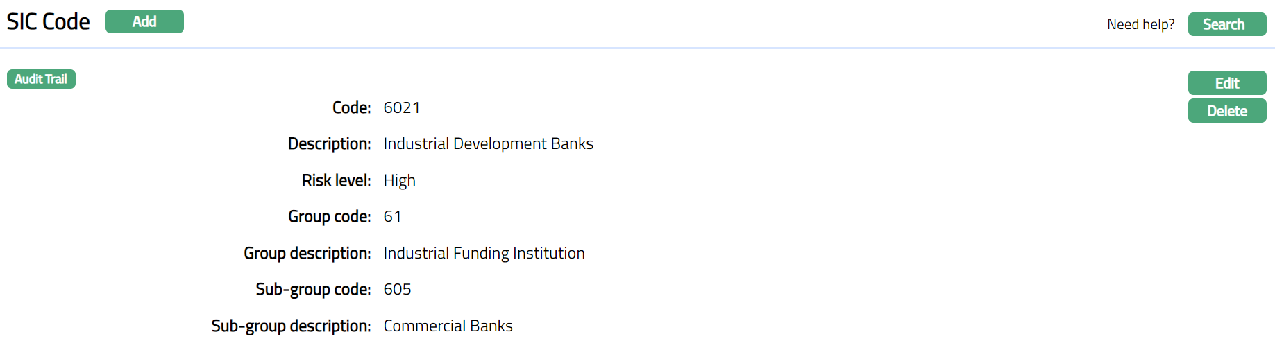 Delete: You can delete a SIC Code by clicking Delete button. When you click on Delete button, Aura displays an alert message. On confirmation, Aura will delete the SIC Code. A SIC Code can be deleted until it is mapped to the Client KYC tab.