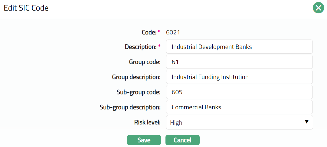 - Click Edit. Edit SIC Code page appears.