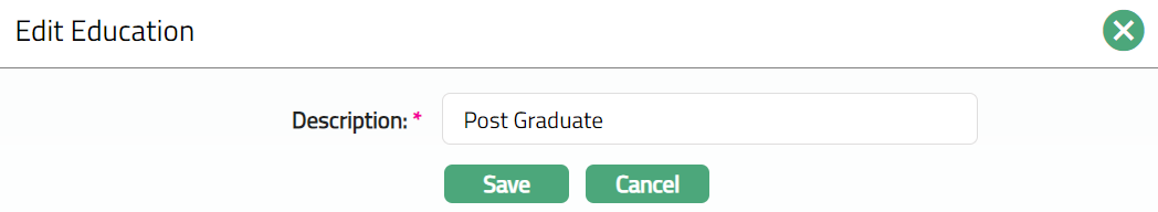 Delete: You can delete the Education by clicking on Delete button. When you click on Delete button, Aura displays an alert message. On confirmation, Aura will delete the Education. The Education record cannot be deleted if it is already in use.