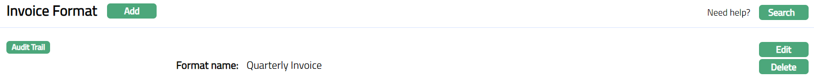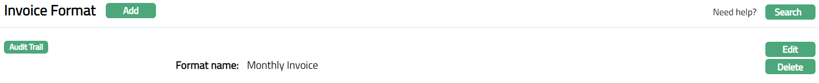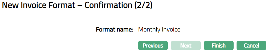 - Click Finish. The Invoice Format page appears displaying the details of the Invoice Format you added.