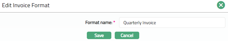Invoice Format is used to maintain the name of any invoice that is to be generated by Aura. This name will be used as a link for invoice generation in any module of Aura / in an external system.