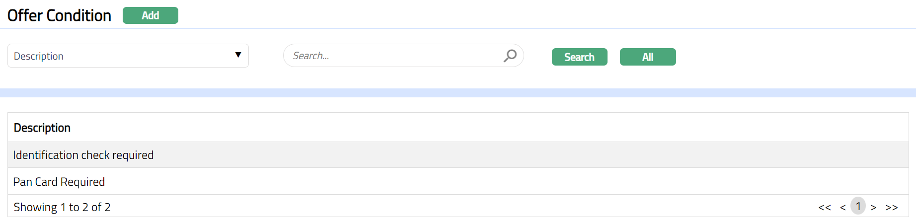 - From Admin menu, click System Codes, Generic definitions, and then Offer Condition. Offer Condition search page appears. All Offer Conditions available in Aura appear on the page, sorted alphabetically.