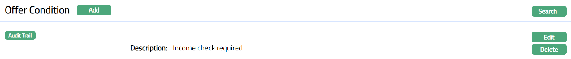 Delete: You can delete an Offer Condition by clicking Delete button. When you click on Delete button, Aura displays an alert message. On confirmation, Aura will delete the Offer Condition. An Offer Condition can be deleted until it is used in an Offer for a Loan Application.
