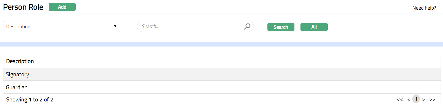 - From Admin menu, click System Codes, Generic Definitions, and then Person role The Person role Search page appears. All Person roles available in Aura appear on the page, sorted alphabetically based on Description.