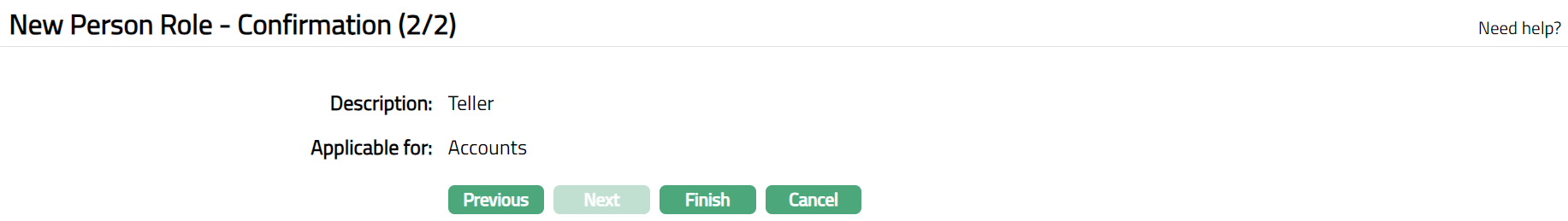 - Click Next. New Person Role -- Confirmation (2/2) page appears.