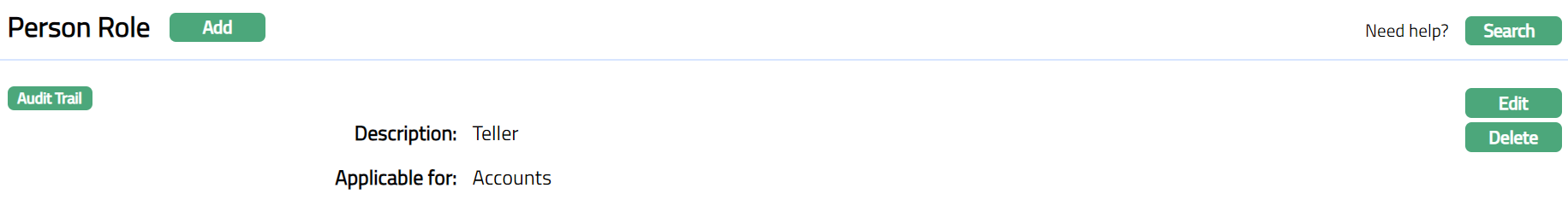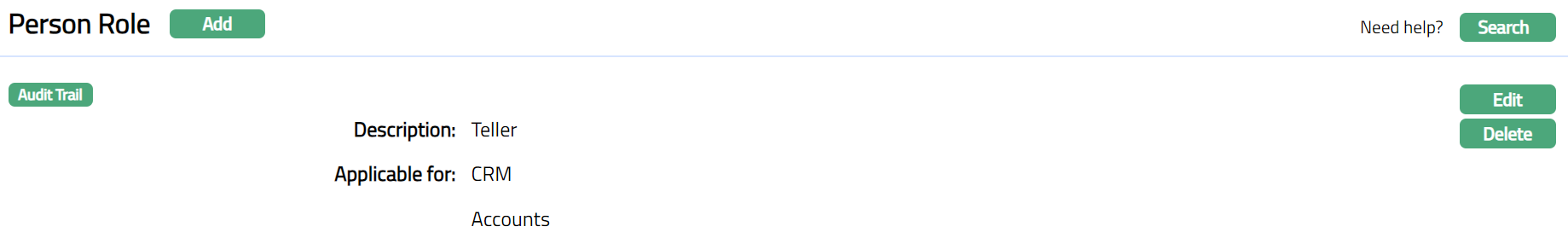 Delete: You can delete a Person Role by clicking on Delete button. When you click on Delete button, Aura displays an alert message. On confirmation, Aura will delete the Person Role. A Person Role can be deleted until it is used in CRM or in Accounts.