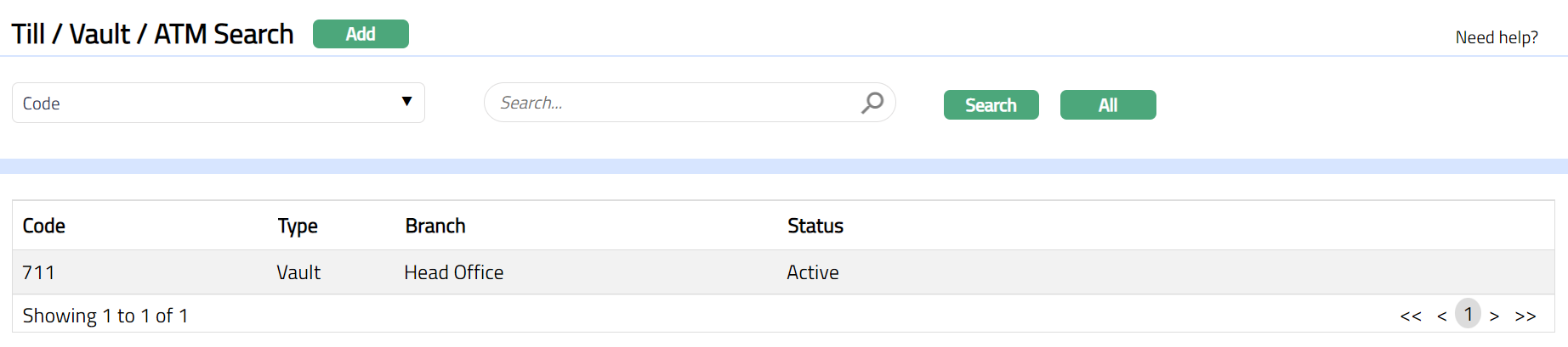 - From Admin menu, click System Codes, Generic Definitions, and then Till / Vault / ATM. The Till / Vault / ATM Search page appears. All Till / Vault / ATMs available in Aura appear on the page.