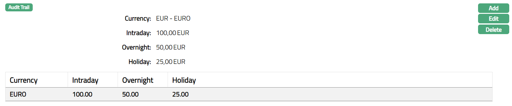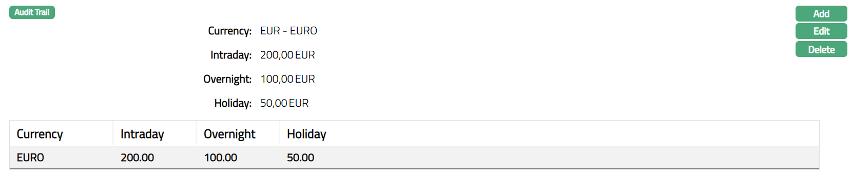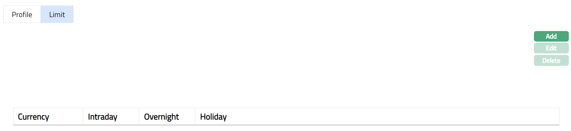[]Under this tab, you can specify the maximum amount of cash that can be held in that Till / Vault / ATM in various currencies. When a new Till / Vault / ATM record is created, the fields related to Limit tab are not created. You need to add them by using Add. You can also edit / Delete the Till / Vault / ATM limit.