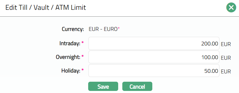 Click Edit. Edit Till / Vault / ATM Limit screen appears as shown below.