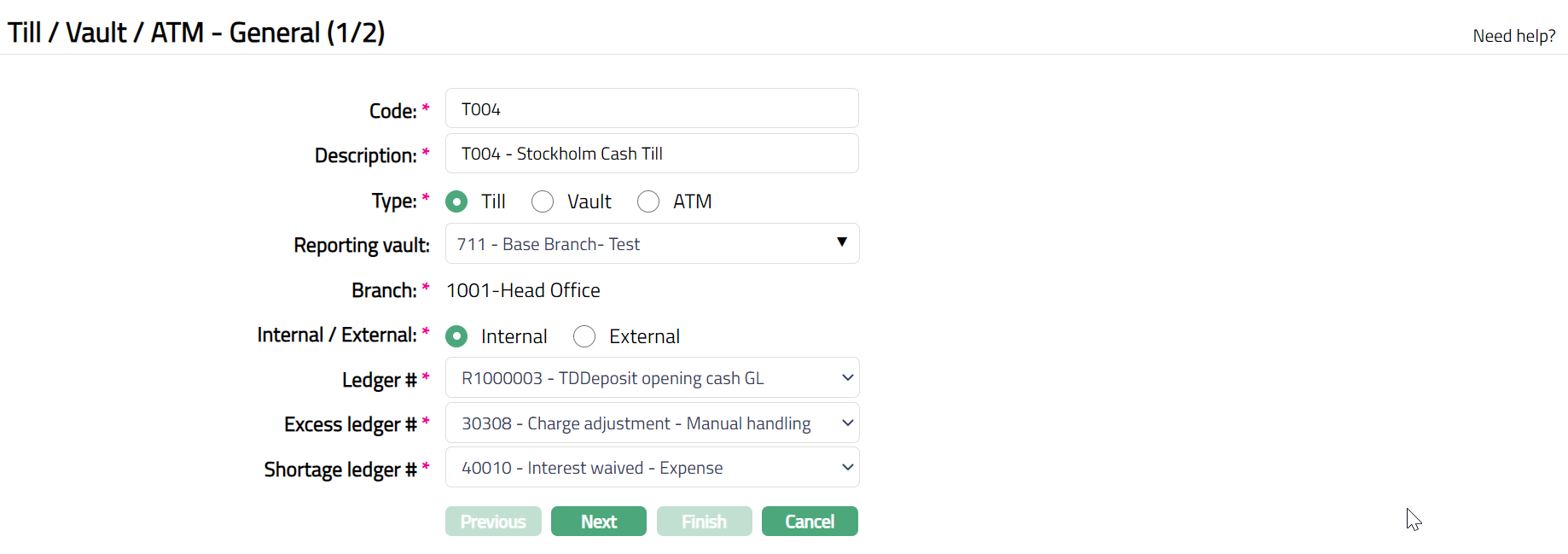 Specify if it is an Internal/External Till / Vault / ATM by selecting appropriate radio button.