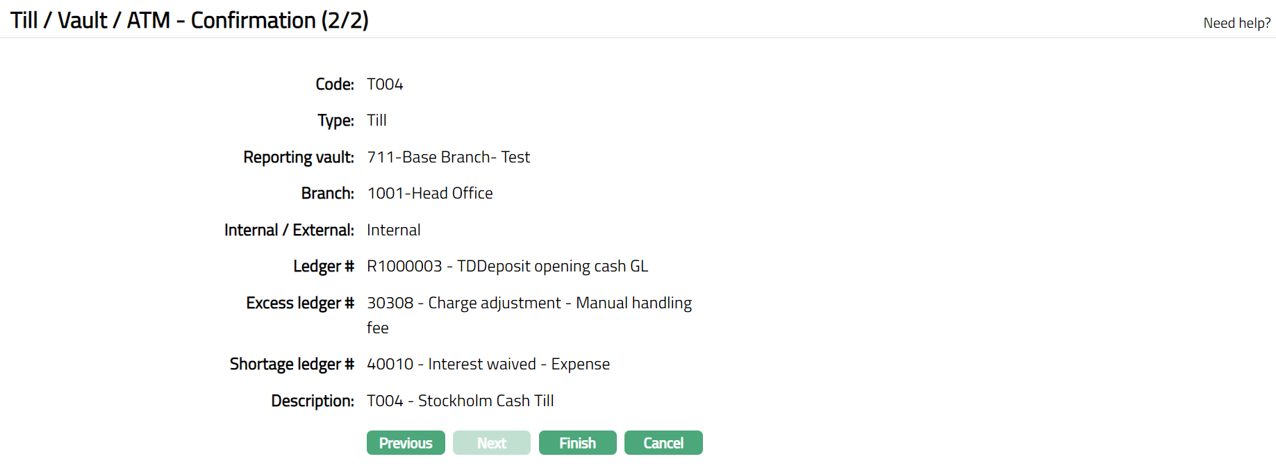 Click Next. Till/Vault/ATM -- Confirmation (2/2) page appears.