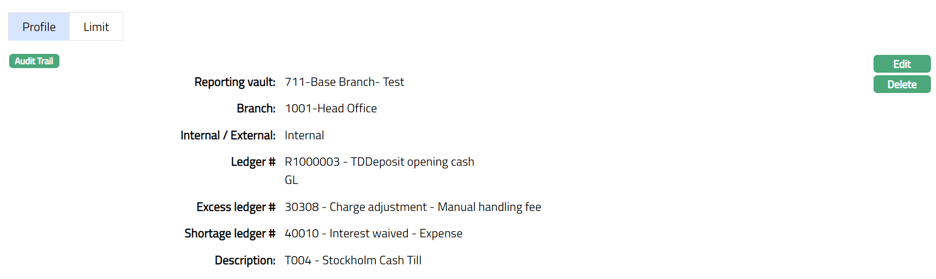 - Access Till / Vault / ATM page. Click Profile tab. The details are defaulted from the entries that you made during Till / Vault / ATM creation. For details refer to Till / Vault / ATM -- General (1/2).