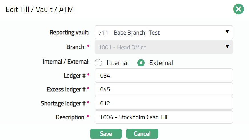Specify a Ledger # in which the balance details of the Till /Vault/ATM are maintained. If Internal option is selected, then Ledger # field allows you to select a ledger # of type Asset maintained in Aura under General Ledger > Accounts. If External option is selected, then Ledger # field allows you to enter manually the Ledger # of your choice.