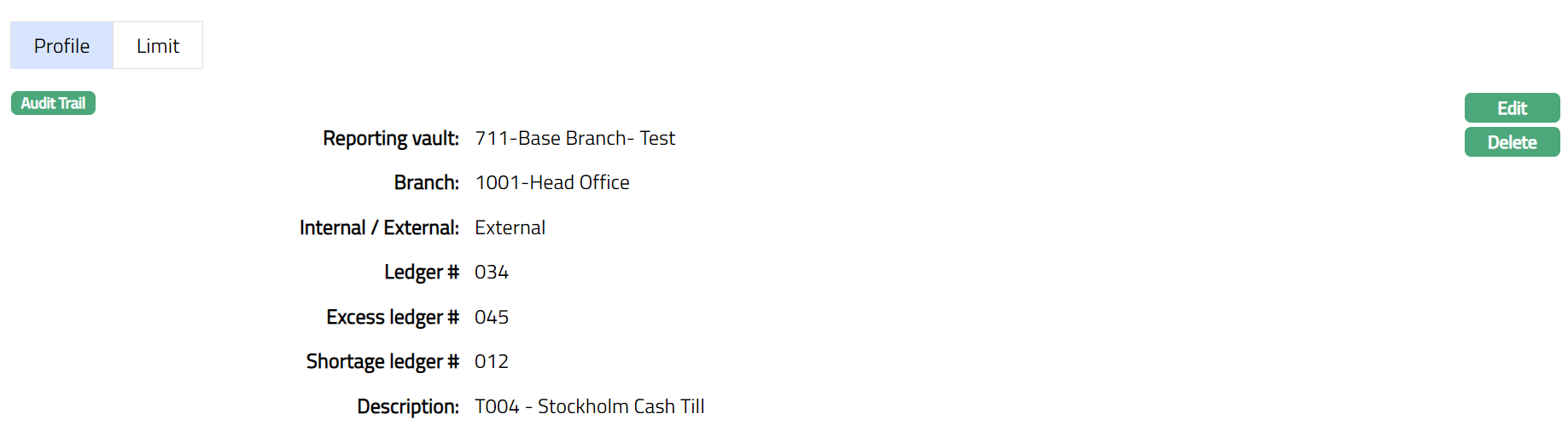 Click Save. Till / Vault / ATM page appears displaying the details of the Limit you added.