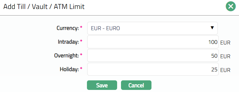 Enter Intra day limit. This refers to the maximum amount of cash that can be held in that Till / Vault / ATM during the business hours of the day.