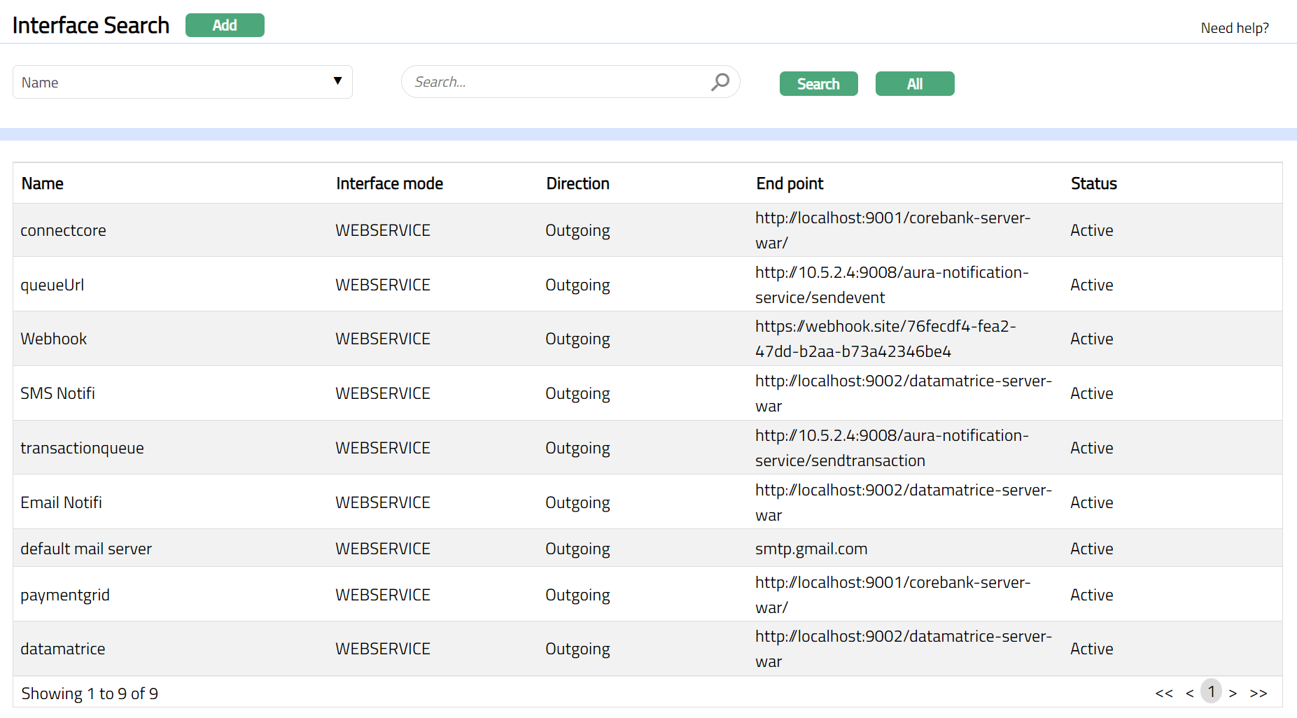 - From Admin menu, click System Codes, Interface definition, and then Maintain. Interface Search page appears. All Interface definitions available in Aura appear on the page.