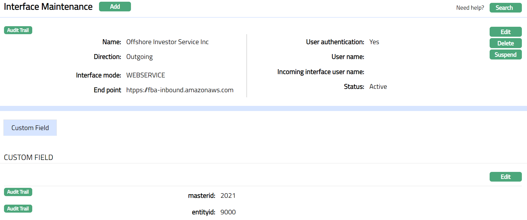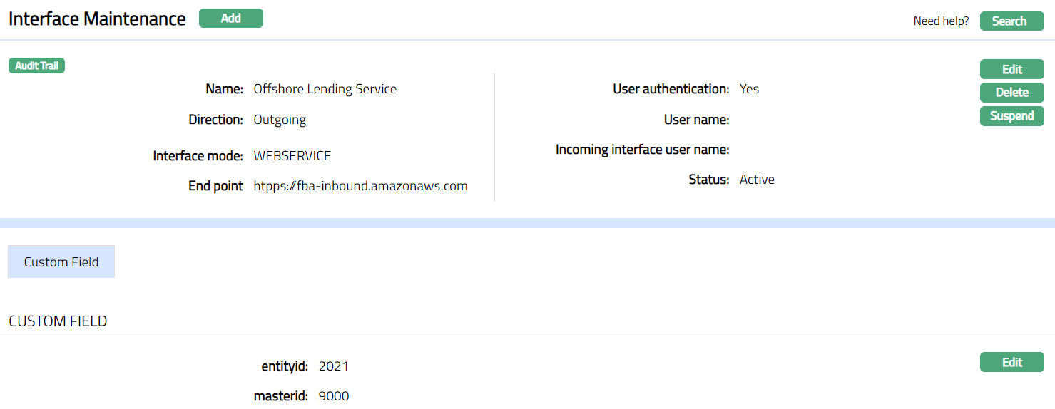 Suspend: If you want to suspend an Interface record then click on Suspend button. Aura will ask for confirmation. On confirmation Aura will suspend the Interface record and Activate button will appear in place of Suspend button.