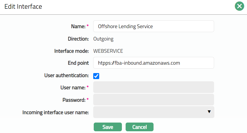 Incoming interface username is to be input when an external system is allowed to access Aura and has to use a specific username and password for the same. These drop-down display list of users that are defined with Type as 'External' in User Maintenance.
