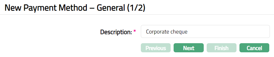 - Click Add. New Payment Method -- General (1/2) page appears.