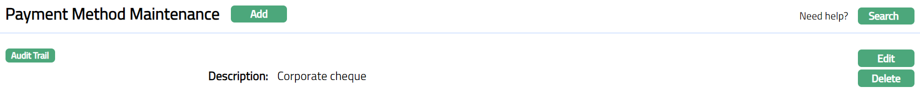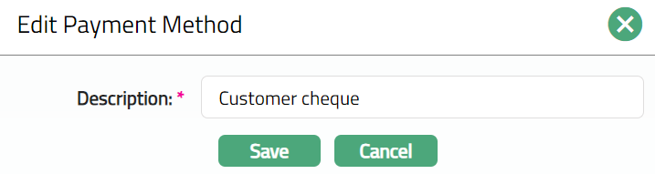 Delete: You can delete a Payment Method by clicking on Delete button. When you click on Delete button, Aura displays an alert message. On confirmation, Aura will delete the Payment Method. A Payment Method can be deleted until it is in use.