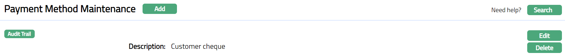 This menu option allows you to maintain different Payment methods. Examples of payment methods include cash, cheque (personal or corporate), credit card, electronic transfer, etc.