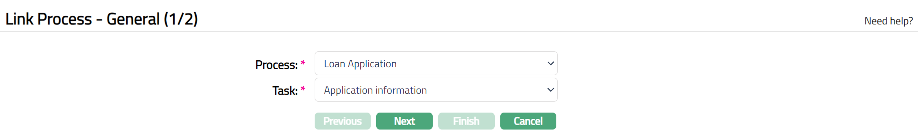 - Click Add. Link Process -- General (1/2) page appears.