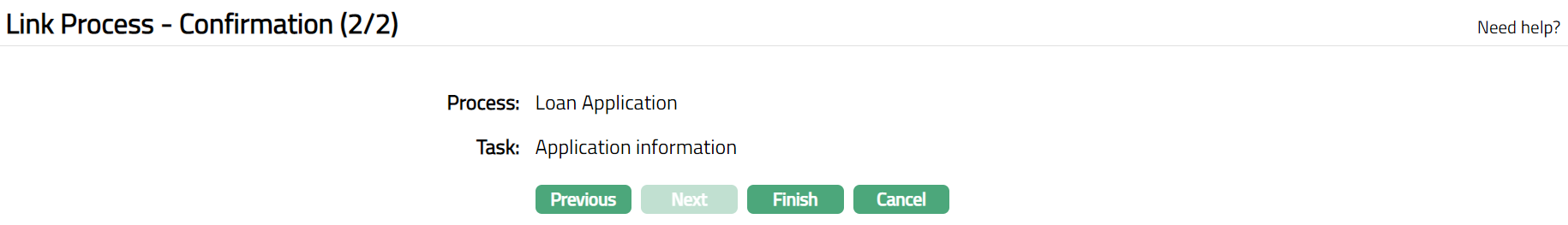 - Click Next. Link Process -- Confirmation (2/2) page appears.