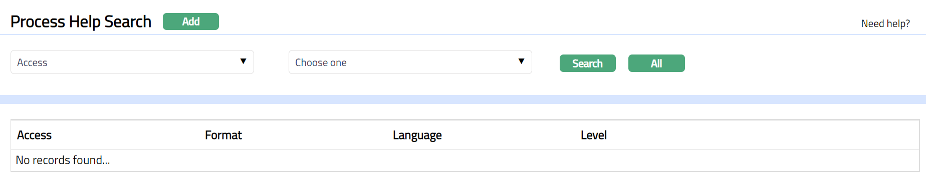 - From Admin menu, click System Codes, and then click Process help under Process. Process Help Search page appears. All Process Help records available in Aura appear on the page.