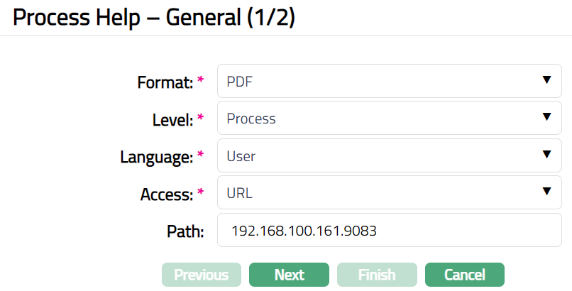- Click Add. Process Help -- General (1/2) page appears.