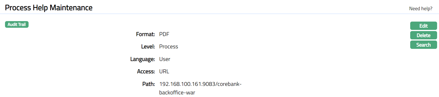 Delete: You can delete a Process Help record saved in Aura by a click on Delete button. Aura will ask for confirmation, on approving which the selected record will be deleted.