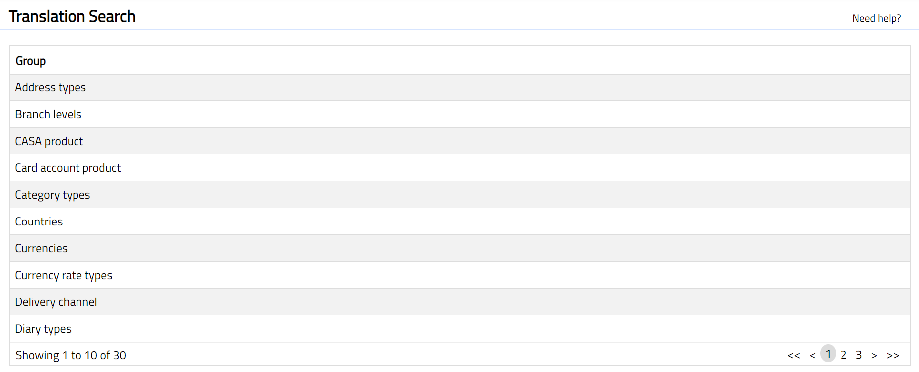 - From Admin menu, click Translations, and then Aura-Data. Translation Search page appears with the list of Groups. A sample screen is given below.