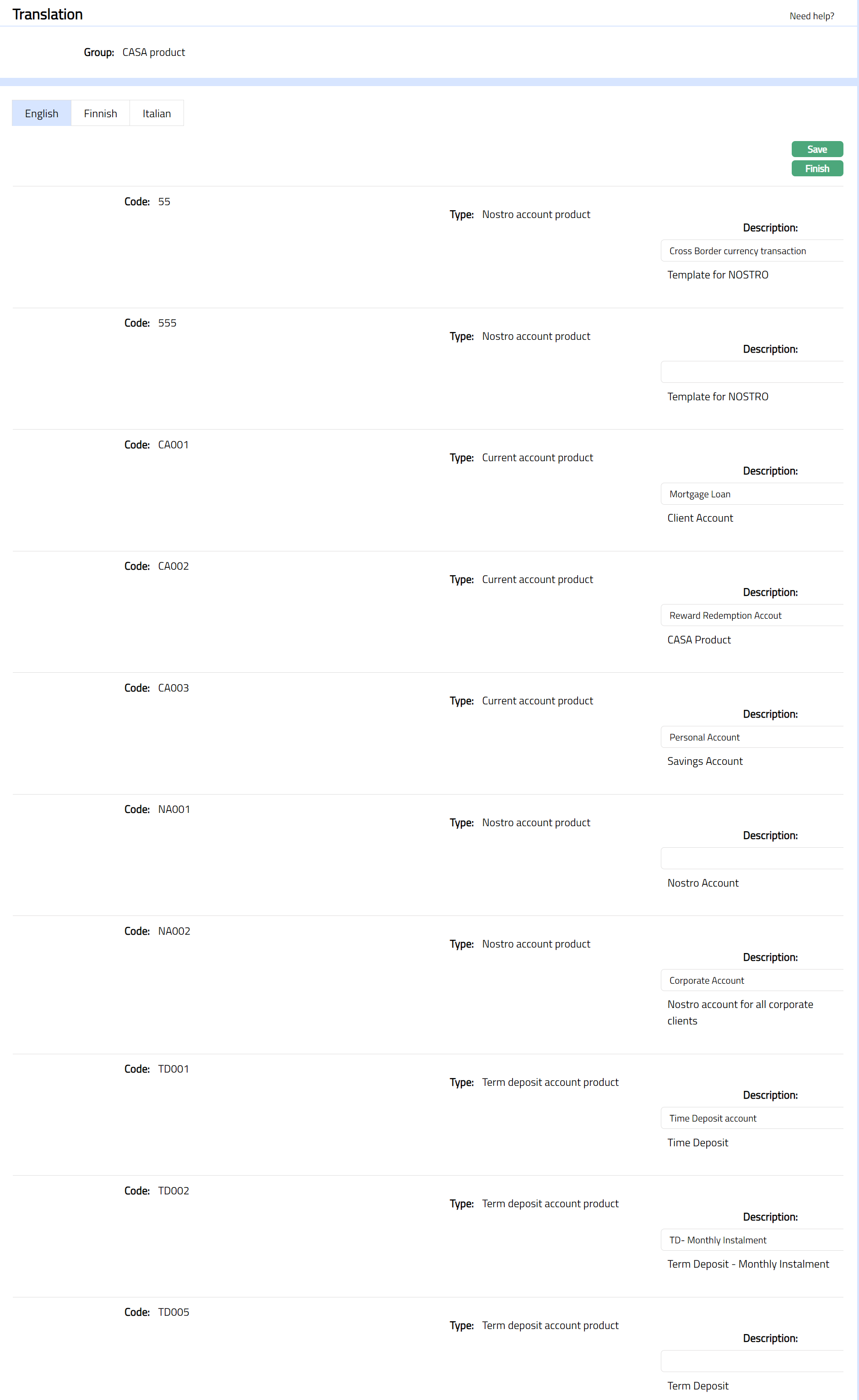 Aura-Data allows you to maintain the values for certain fields like Name / Description in different languages. By default, Aura takes in the values for the fields in English, but you can also maintain the translated values in any other language. The values maintained in the Translations option for various languages are used only in outputs (like Statements) -- and not for display on screen.