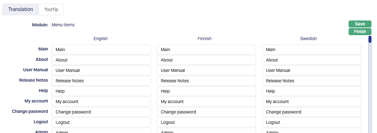 3. Click the View Tool Tip button for the sub-module you want to access. You will be taken to the translation screen where the labels are listed on the left, and language-specific columns (e.g., English, Finnish, Swedish) appear across the top. However, some modules may not display any fields for editing.