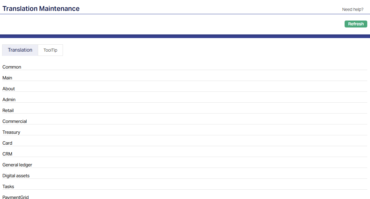 1. From Admin menu, click Translations, and then Aura-Label. Translation Maintenance page appears with the list of modules such as Retail, CRM, Treasury, Card, and others. Make sure the Translation tab is selected.