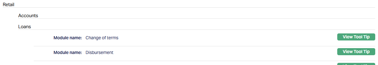 2. Click on a category (e.g., Admin or Retail). This opens a list of sub-modules, each with a View Tool Tip button.