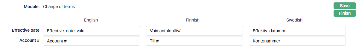 4. Enter or update the translated text for each label in the appropriate language field. For example, to update the Finnish translation for "My account", just type the translated term into the Finnish column beside that row.