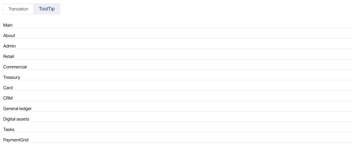 1. From the Translation Maintenance screen, click on the ToolTip tab. The module categories are listed like in the Translation tab.
