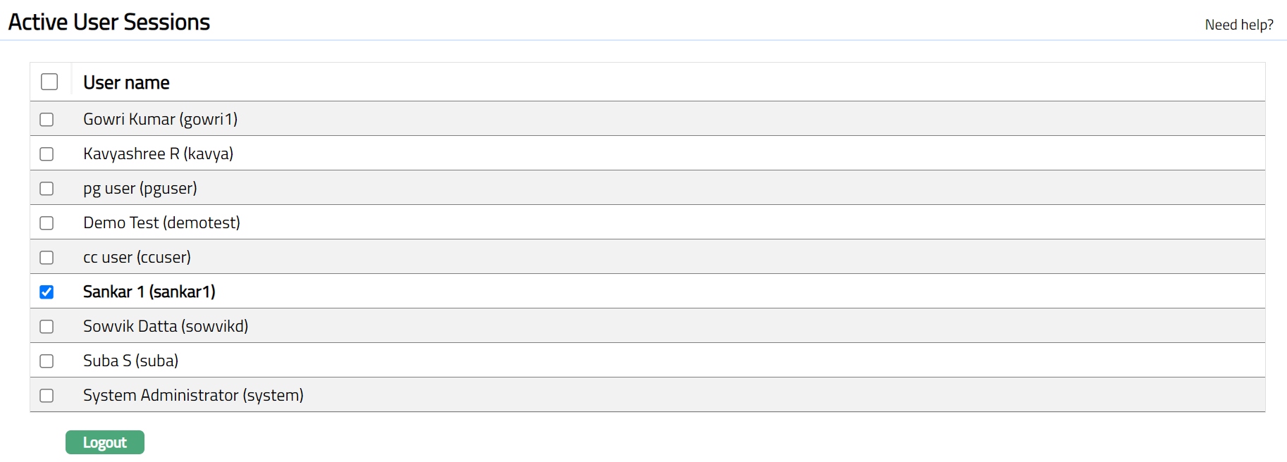Select checkbox next to the relevant Username / names. Click Logout to terminate the selected user active session / sessions.