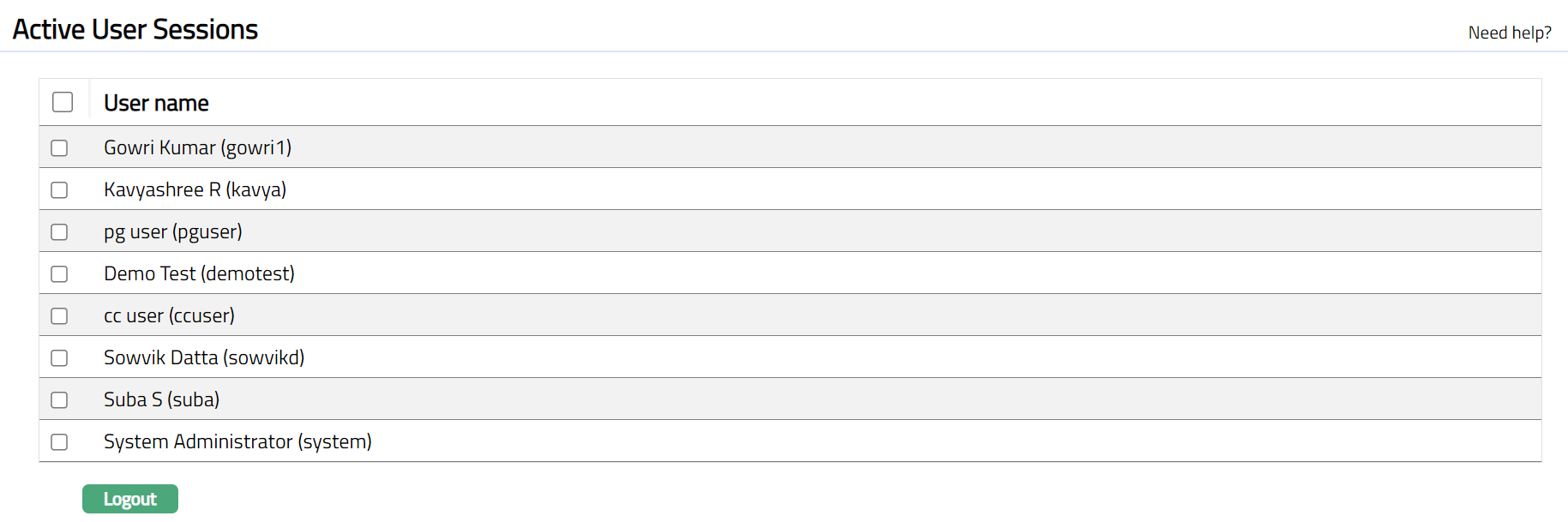 Select Username checkbox located on the header row to automatically select all active users. Click Logout to discontinue all user active sessions. When you click on logout button, Aura displays an alert message. On confirmation Aura will logout the selected user.
