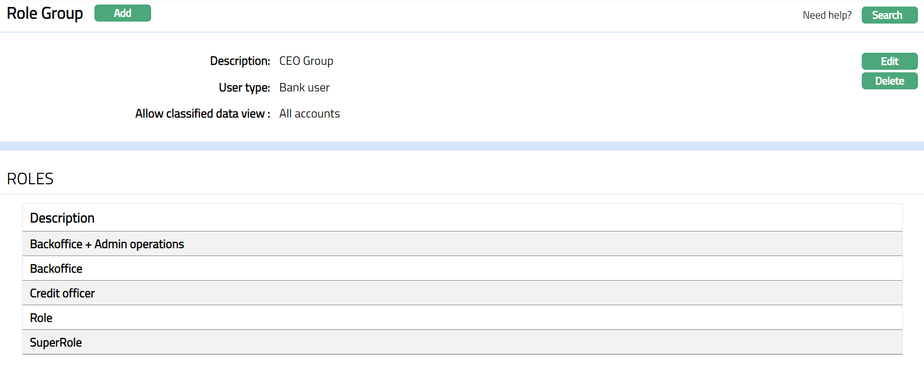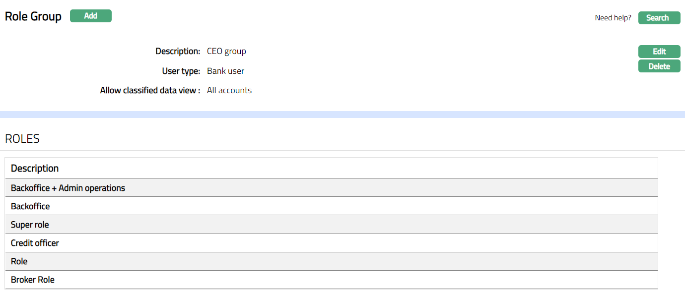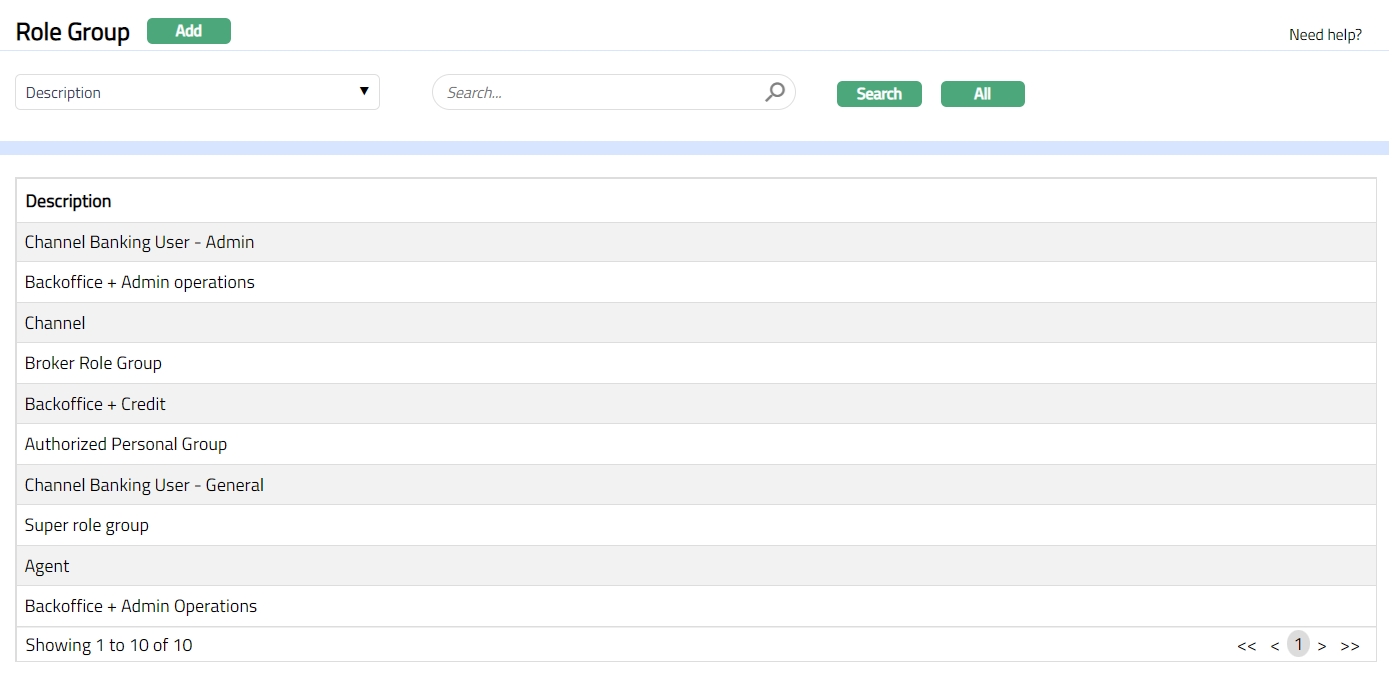 - From Admin menu, click User and then Role Group. The System will display the Role group search page. The list of all the Role groups maintained in Aura will be displayed.